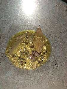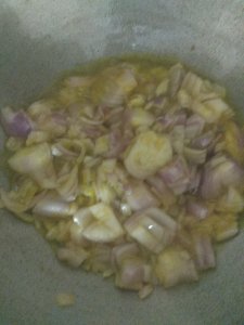 Heat a tsp of oil in a pan. Add onion and saute for a couple of minutes. To this add the sliced green chili, ginger garlic paste, pepper, mint and coriander leaves, garam masala and salt. Cook them all together for about 2 to 3 minutes and then switch off the flame.