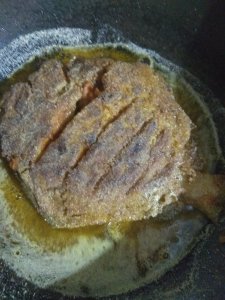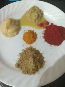 Heat oil in a kadai and add the ginger garlic paste and saute until the raw smell disappears. Next add the coriander powder, cumin powder, chili powder and chat masala and salt and cook them all together.