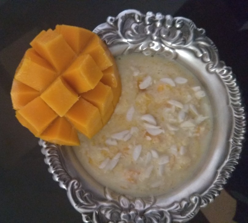The great Indian summer is here and indeed a perfect time to enjoy the king of fruit —- mango. One cannot stop drooling over the delicious and juicy fruit as it is the best part of summer inspite of the scorching heat. This bright yellow fruit has made fan of all ages as it not only tastes good but is also loaded with health benefits. I have been enjoying the mango kheer since childhood and now so does my children. It is a very unusual yet delicious kheer with the goodness of sweetened and thickened milk along with juicy mango.